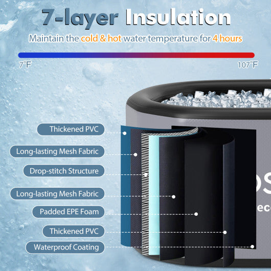 Price Match PolicyThe Costway RecoveryPro Oval Ice Bath delivers professional-grade cold water therapy in a portable design. Its 129-gallon capacity and 44" inner length accommodate complete leg extension for users up to 5.9 feet tall, while the robust drop-stitch construction supports up to 800 lbs. Advanced 7-layer insulation maintains optimal temperature within 4 hours, supporting water temperatures from 7°F to 107°F for both cold plunge and warm soak applications. The 1/2" female threaded inlet and outlet integrate seamlessly with external water chillers for precise temperature control. Includes a hand pump for rapid 2.5-minute inflation, protective floor mat, convenient backpack for transport, and repair kit for sustained performance. Ideal for athletes and fitness enthusiasts seeking evidence-based recovery solutions to reduce muscle soreness and accelerate post-training restoration.